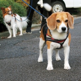 ▲ビーグル犬の温厚なバロンくん4 才、シャイなラッキーくん3 才パピオン犬です